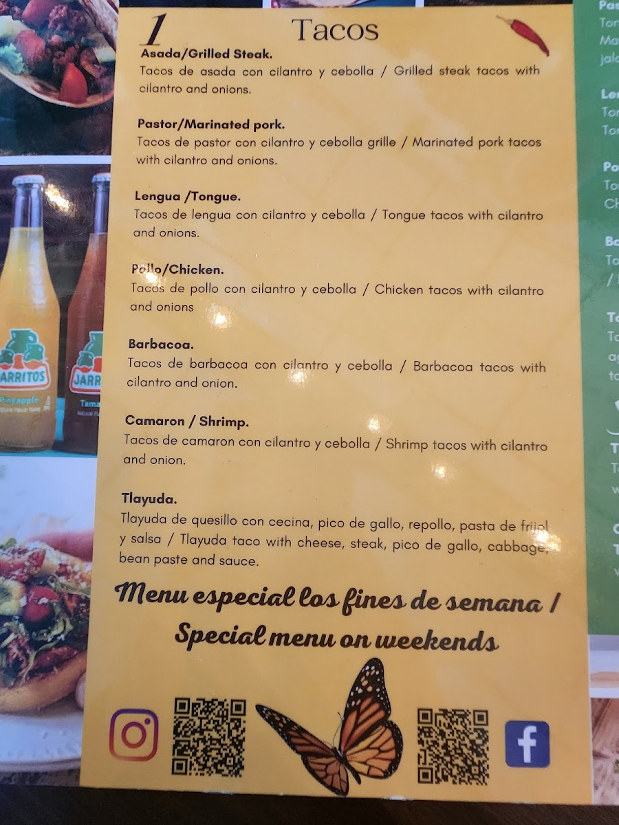 - A variety of tacos including Lengua (tongue) and Pastor